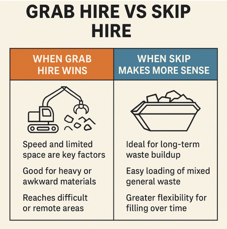 Ultimately, grab hire and skip hire serve different needs. The right choice depends on your site conditions, the volume and type of waste and how quickly you need it cleared. There is no universal “better”, only what’s right for your specific project. If you have bulk waste and limited access, grab hire is likely the smarter move. For phased or varied clear-outs, skip hire is a dependable option.