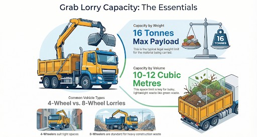 Grab lorries are used across a wide range of domestic and commercial projects, each with different capacity considerations.
